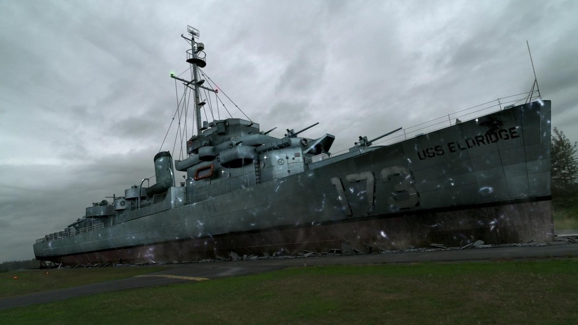 1943 Ekim’inde Philadelphia Askerî Tersanesi’nde, DE-173 numaralı ve USS Eldridge adlı toplarla donatılmış bir ABD Donanması eskort muhribinde bir deney yapıldı. Deneyin içeriği, gemiyi hem göze hem de radara görünmez duruma getirecek bir kuvvet alanı yaratmaktı. Deney hem kıyıda hem de yakındaki gemilerde bulunan yüzlerce, belki de binlerce, denizci tarafından izlendi. Ne yazık ki deneyin yapıldığı gemideki tayfa ciddi yan etkilere maruz kaldı. Bazıları geminin metalinin içinde tekrar vücut buldu, bazıları bir daha hiç görülmedi, bazıları da esrarengiz görünüp kaybolmalar nedeniyle yıllarca eziyet çekti veya çıldırdı. Tipik Donanma tarzıyla, hepsi inkâr edildi.