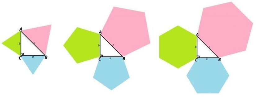 Şekilde gösterilen dik üçgende bir kenar uzunluğu aa, bb ve cc kenarlarına eşit olacak şekilde, aynı (hepsine üçgen, hepsine beşgen vb.) düzgün geometrik şekiller yerleştirdiğimizde, aa ve bb kenarındaki şekillerin alanları toplamı, cc kenarındakinin alanına eşit olur. Bu şekillere üçgenin her bir kenarını çap kabul eden daireler de dâhildir. Aşağıdaki görselde ne demek istediğimizi daha iyi anlayabilirsiniz.