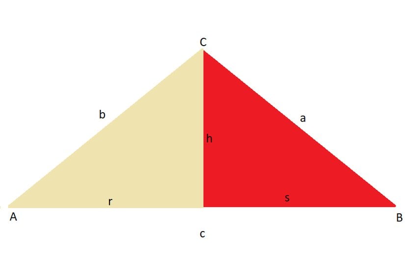 Daha sonra bu üçgenin hipotenüs kenarına bir dikme indirelim (hh ile gösterilen yer). Bu durumda üçgende benzerlik kuralları gereği (açı-açı benzerliği) CBECBE (üçgenin sağ yarısı) veABC ABC (büyük üçgen) üçgenleri benzer olurlar çünkü BB açısı ortaktır ve EE ile CC açıları her iki üçgenin de dik olan açılarıdır. Sonuç olarak bu iki üçgenin tüm iç açıları birbirine eşit olduğundan benzerlerdir diyebiliriz. Benzer olan bu iki üçgen arasında s/a=a/cs/a = a/cbağıntısını yazmak mümkündür. Eşitliğin her iki tarafını da acac ile çarptığımızda da sc=a2sc = a^2 sonucunu elde ederiz.