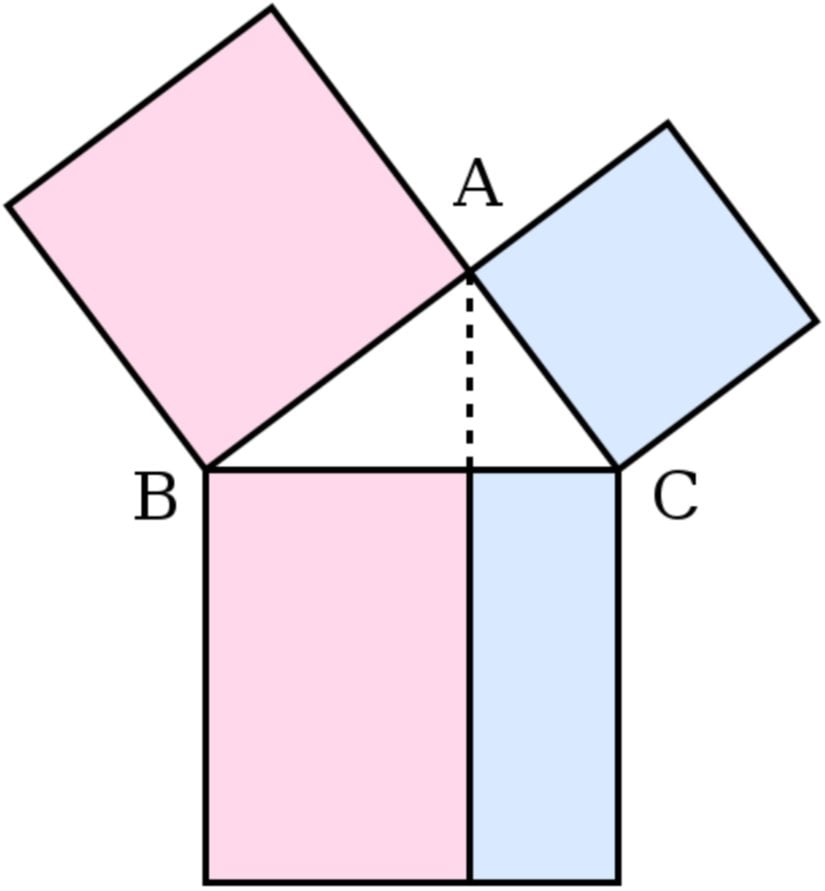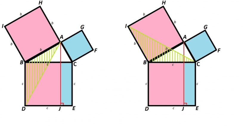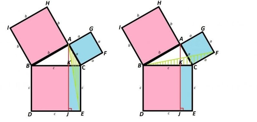 Aynı iki doğru arasında bulunan ve taban uzunlukları eşit olan bir dikdörtgen ve üçgenden, dikdörtgenin alanı üçgenin alanının iki katı olur. Bu durumda BDJK dikdörtgeninin alanı, BDA üçgenininkinin iki katı (ikisi de BD ve AJ paralel doğruları arasında); BAHI karesinin alanı da IBC üçgenininkinin (her ikisi de IB ve HC paralel doğruları arasında) iki katı olur. Üçgenlerin alanı eşit olduğundan, belirtilen dikdörtgenlerin alanları da eşit olacaktır.