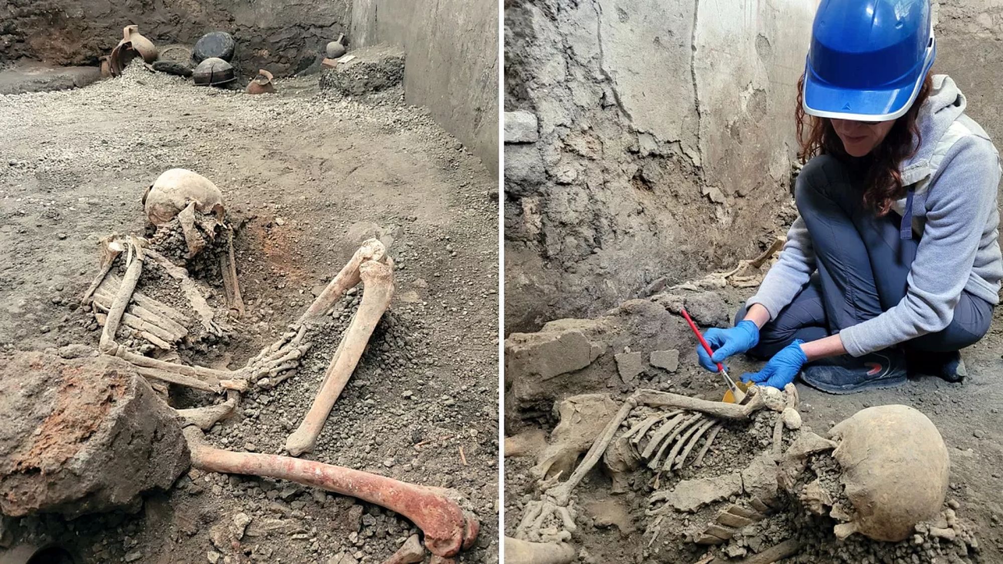 Araştırmacılar, her ikisi de yaklaşık 50 yaşlarında olan iki erkek iskeleti buldu. Durdukları yerlere bakılırsa ilk birey büyük bir duvar parçasının aniden çökmesiyle ezilmiş ve ağır travmalar sonucu hemen ölmüş. İkinci birey ise tehlikenin farkında gibi duruyor. Araştırmacılar volkanik tortularda ahşap bir nesnenin izlerine rastladı. İkinci birey, bununla kendini korumaya çalışmış olabilir.