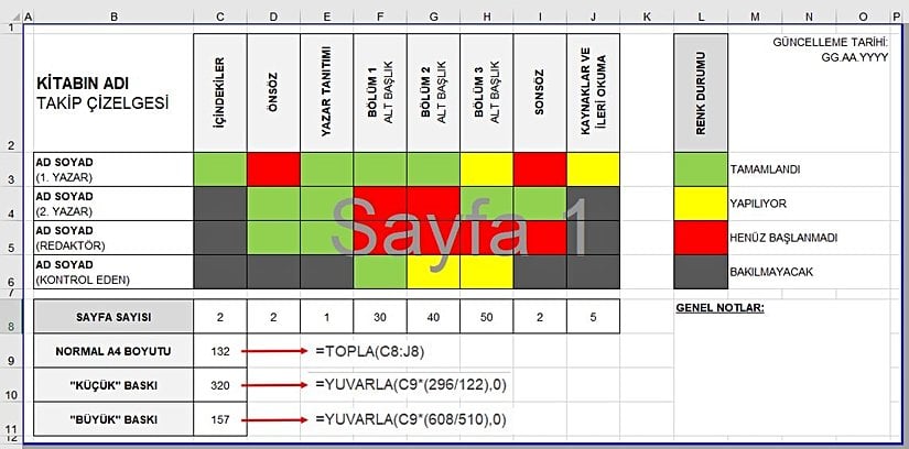 Bu bir şart olmasa da, işleri takip etmenizi kolaylaştıracaktır, özellikle ortak bir çalışmada yer alıyorsanız. Örneğin biz bir Excel tablosu oluşturup renk kodlarıyla durumlar belirledik (alttaki görsele bakınız), farklı kişilerin ele alacağı kısımları belirleyip kimlerin ne durumda olduklarını takip ettik, aynı zamanda en altındaki sayfa sayısıyla da hem küçük hem de büyük baskı konusunda kaç sayfalık bir eser hazırladığımızı görebilmiş olduk.