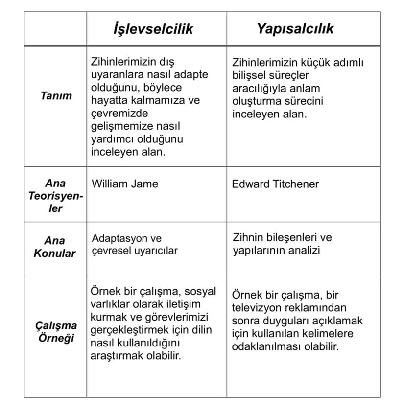 Yapısalcılık, işlevselcilik gibi temel bir teoridir. İşlevsel psikolojinin odaklandığı nokta daha çok zihnin hayatta kalmak için çevresine nasıl uyum sağladığıdır. Yapısalcılık ve işlevselciliğin temel farkları aşağıda görülebilir:[2], [3], [4]