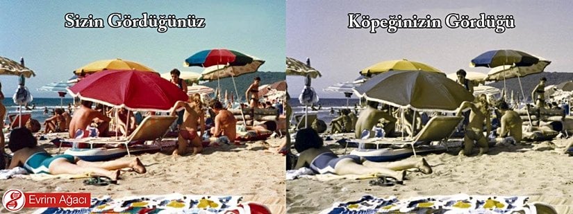 "Köpekler renk körüdür." dendiğinde bazen "renkleri algılayamazlar" gibi bir düşünce oluşabilmektedir. Halbuki insanlardaki renk körlüğü gibi, köpeklerdeki renk körlüğü de renklerin hiç görülememesi değil, sadece bazı renklerin ayırt edilememesi durumudur. Görselde bunun nasıl bir görüntü yaratabileceğine yönelik bir model gösterilmektedir: