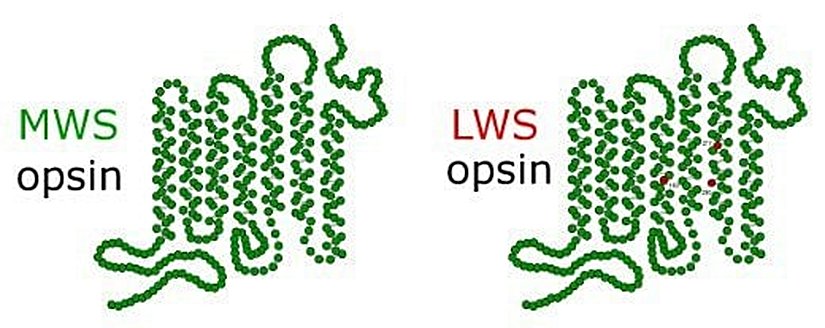 İşte bu sorunun cevabını, evrimsel biyoloji ve popülasyon genetiği harika bir şekilde verebilmektedir! Genlerimize bakan araştırmacılar, bizde ve yakın kuzenlerimizde, diktromat memelilerdeki MWS/LWS opsin geninin 2 kopyası olduğunu buldular. Bunlardan daha orta uzunluktaki dalgaboylarına duyarlı olana MWS deniyor; daha uzun dalgaboylarına hassas olana ise LWS. Aşağıda, bu iki proteinin neye benzediğini görebilirsiniz: