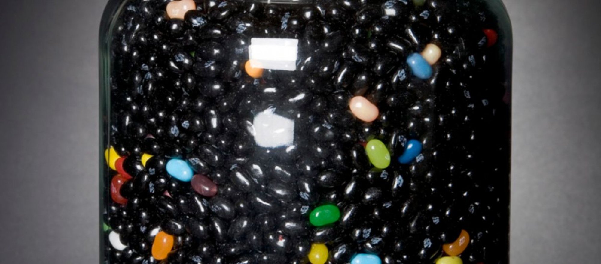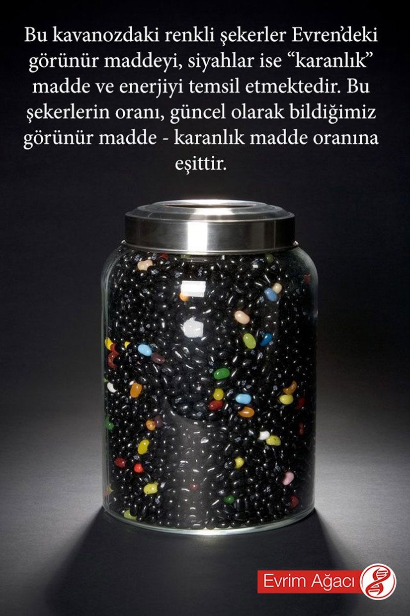 Bu şeker kavanozunun içindeki renkli şekerler "görünür" yani bildiğimiz maddeyi, siyah şekerler ise "görünemeyen" ya da diğer adıyla karanlık maddeyi temsil ediyor.