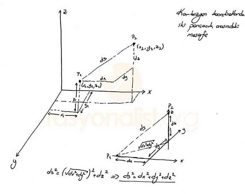 Gündelik yaşantımızda, iki nesne arasındaki uzaklığı tanımlamak oldukça kolaydır. En basitinden bir koordinat sistemi yardımıyla uzaklık tanımlayabiliriz. Kartezyen, yani (x,y,z)(x,y,z) koordinat sistemi üzerinde iki parçacığı yerleştirdiğimizi düşünelim. Bu iki parçacığın (x,y,z)(x,y,z) koordinatları arasındaki uzaklık farkları (dx,dy,dz)(dx,dy,dz) ise, bu durumda aralarındaki mesafe dsds'yi aşağıdaki şekilde ifade ederiz: