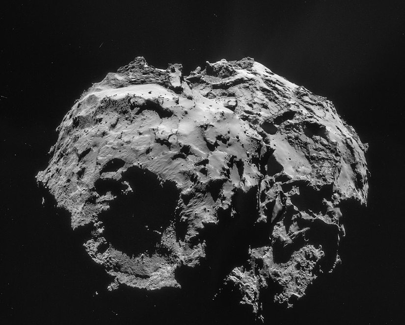 14 Şubat 2015 Sevgililer Günü'nde çekilmiş bir fotoğraf... Bu tarih, Rosetta'nın ilk defa 67P'ye bu kadar yaklaştığı tarih... Aralarında sadece 6.5 kilometre kalacak kadar yaklaştı. Burada gördüğümüz, kuyrukluyıldızın baş bölgesindeki çöküntü.