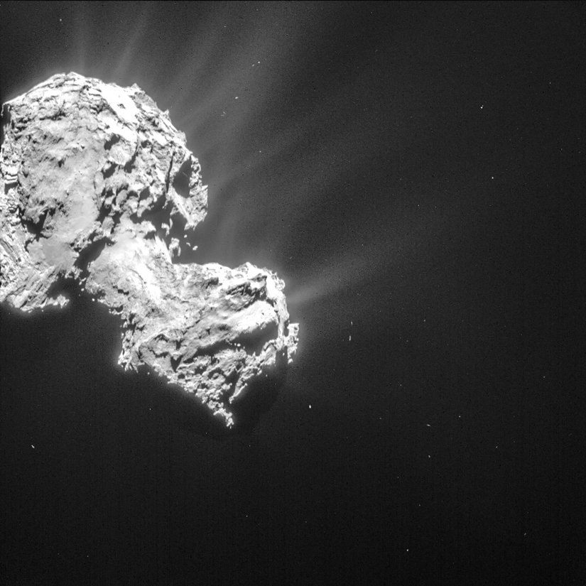 Aşağıdaki, kuyrukluyıldızın daha aktif olan bölgelerinin ortada yer aldığı bir zamanda çekilmiş bir fotoğraf. Burada Rosetta 102 kilometre uzakta.