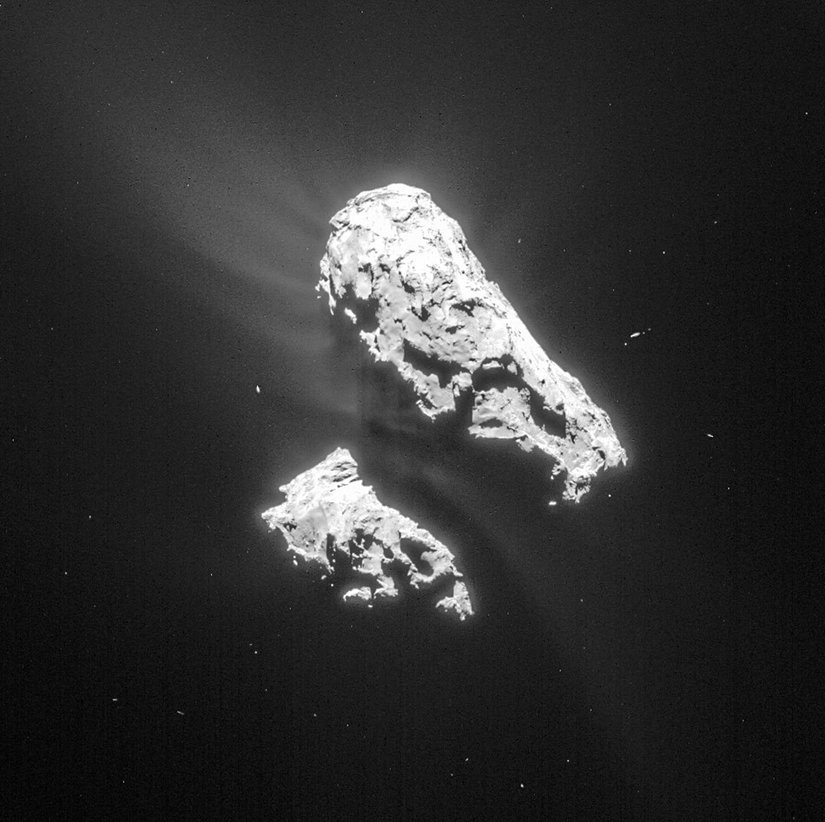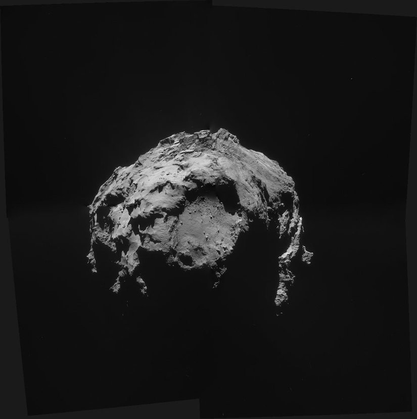 Aşağıda Rosetta, 67P'den 72 kilometre uzaklıkta. Kuyrukluyıldızın gaz ve tozdan oluşan "kuyruk" kısmı bir hale gibi fotoğrafta görülüyor. Bu gazlar ve tozlar, kuyrukluyıldızın aktif olan bölgelerinden fışkırıyor ve 67P Güneş'e yaklaştıkça, bu maddenin miktarı da hızla artacak. Aşağıda, diğer açılardan çekilmiş başka fotoğraflar da görülüyor: