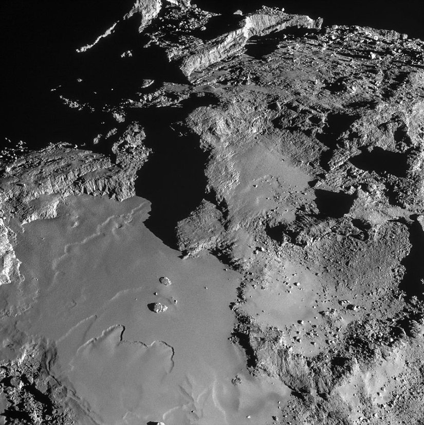 Aşağıdaki Rosetta, 67P'den 83 kilometre uzaktayken çektiği bir fotoğraf... Burası, kuyrukluyıldızın "karın bölgesi" olarak biliniyor; çünkü daha düz. Ortada gördüğünüz daha da düzgün olan, üzerinde kaya blokları gözüken bölgeye Imhotep adı veriliyor.