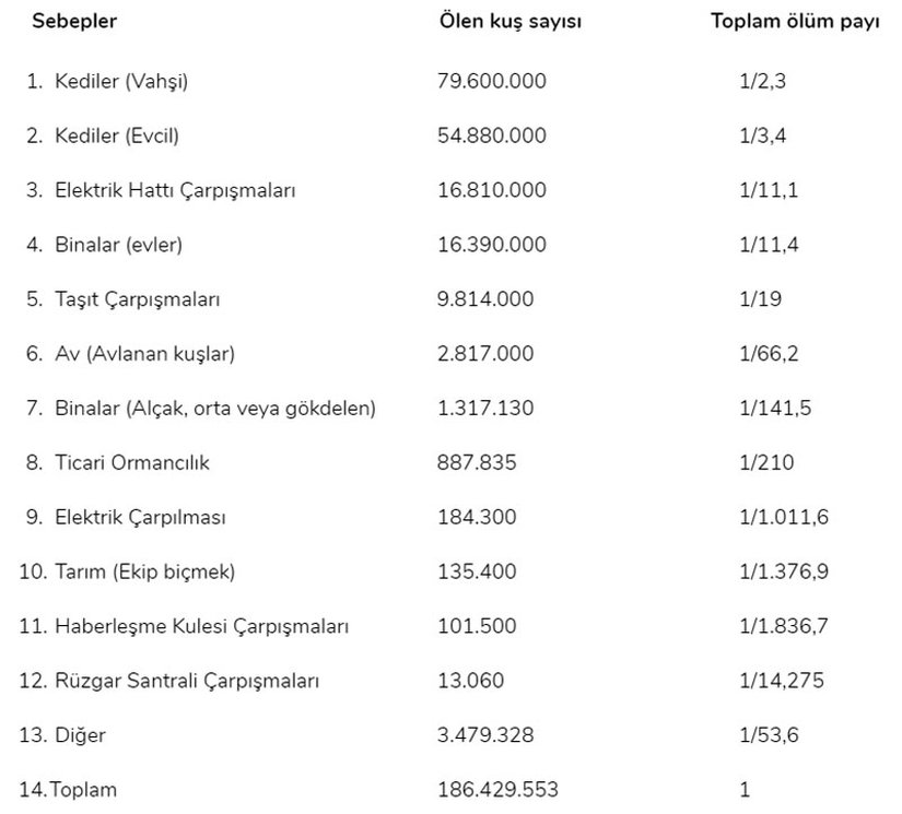 Aşağıdaki tabloda insan faaliyetlerinden kaynaklanan toplamda tahmini olarak yıllık 186,429,553 kuş ölümünün belirli sebepleri gösterilmiştir.