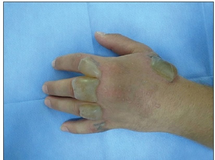 21 yaşında erkek hasta, sol elinin üst kısmında birçok farklı bölgede meydana gelen ikinci derece yanık ve su toplaması şikayetiyle hastaneye başvurmuştur. Hastayla yapılan sözlü görüşmede, hastanın elinin üzerinde bazı bölgelerde dövmelerinin olduğu, bunları doğal yoldan çıkarmak amacıyla birkaç diş sarımsağı ezerek sofra tuzuyla karıştırdıktan sonra dövmelerin üzerine uyguladığı öğrenilmiştir. 4 saat sonra şiddetli acı hisseden hasta, bu nedenle hastaneye geldiğini söylemiştir. Hastanın tamamen iyileşmesi birkaç haftayı bulmuştur ve elbette dövmeleri silinmemiştir.[20]