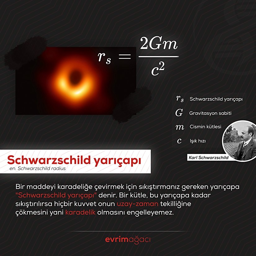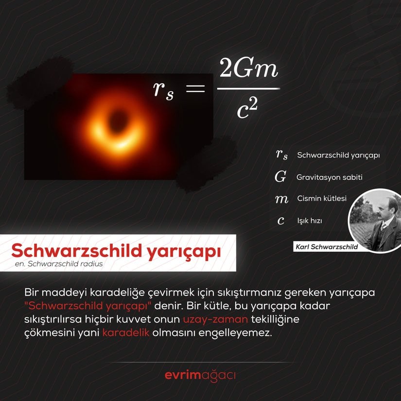Schwarzschild yarıçapı bir kara deliğin merkezine olan uzaklıktır ve bu mesafenin altında kalan hiçbir şeyin, ışığın bile, kurtuluşu yoktur. Büyüklüğü, sadece kara deliğin kütlesine bağlı olan "olay ufkunu" duymuş olmalısınız; Buradaki G ve (c2) sabitleri kilogramdan metreye dönüşüm yapmamıza yardım eden sabitlerdir. Yani denklem, 1.49*10-27 kere kütle şeklinde de yazılabilir.