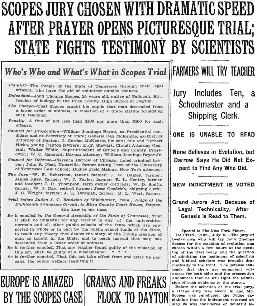 Teşekkür: Bu yazıyı kaleme alan Cemal Tunçdemir'e teşekkür ederiz. Orijinali Amerika Bülteni üzerinden okunabilir. Ayrıca konuyla ilgili olarak Inherit the Wind isimli filmi izlemenizi önemle tavsiye ederiz.