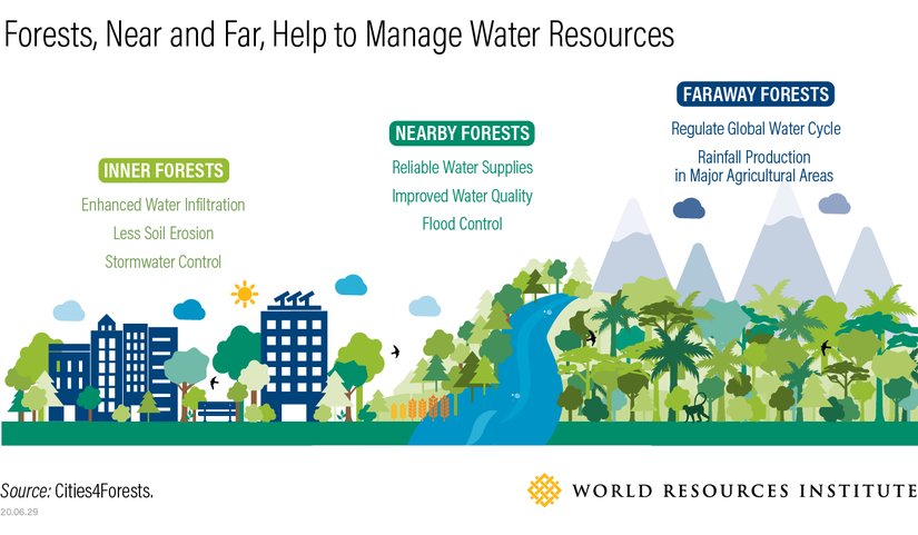 Şehir sınırları içinde, yerel su havzalarında ve hatta binlerce kilometre ötede ormanlar suyun hareketini, kalitesini ve kullanılabilirliğini değiştirmektedir. Dünyanın kentsel liderleri, kent sakinleri ve kentlerin dayandığı tarım arazileri için temiz su sağlamada ormanların rolünü hesaba katmalıdır.