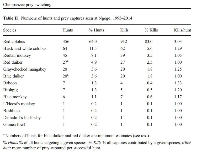 Buna rağmen bu 556 ayrı avlanma davranışı, şempanzelerle ilgili bize önemli bilgiler vermektedir. Örneğin bu avlanma girişimlerinin 356 tanesi, doğrudan kolobus maymunlarına yöneliktir. Kuzenlerimiz, geri kalanlarında başka maymun türlerini, diğer memeli hayvanları ve bulabildikleri diğer canlıları avlamışlardır.