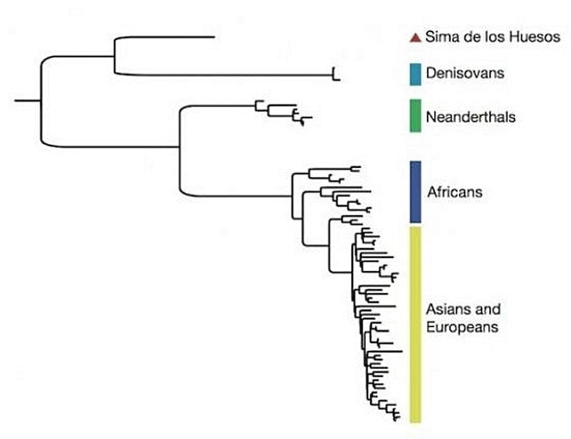 Görselde, yapılan evrimsel analize göre Sima İnsanları'nın yeri gösteriliyor (en üstteki dal). Görülebileceği gibi Sima İnsanları, Denisova İnsanlarına yakın akrabadırlar.