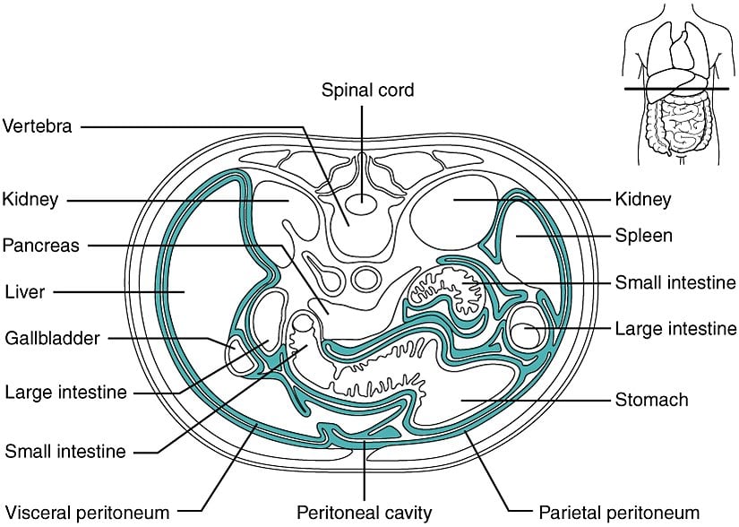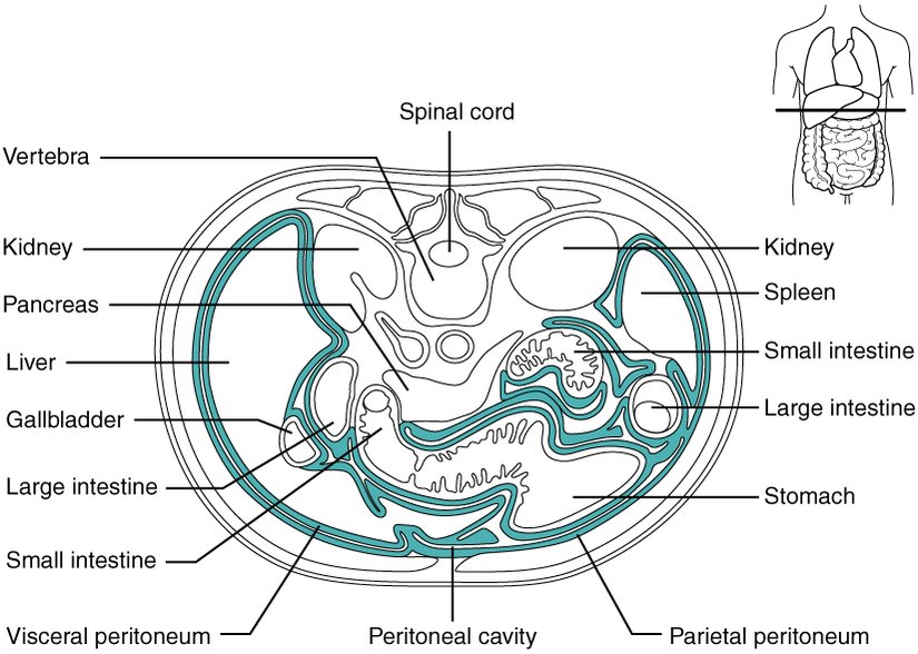 Karın boşluğu içindeki sindirim organları, bağ dokusu ile çevrili yassı epitel dokudan oluşan geniş seröz membranöz bir kese olan periton tarafından yerinde tutulur. İki farklı bölgeden oluşur: karın duvarını kaplayan parietal periton ve karın organlarını saran visseral periton. Periton boşluğu visseral ve parietal periton yüzeyleri tarafından sınırlanan boşluktur. Birkaç mililitre sulu sıvı, peritonun serozal yüzeyleri arasındaki sürtünmeyi en aza indirmek için kayganlaştırıcı görevi görür.