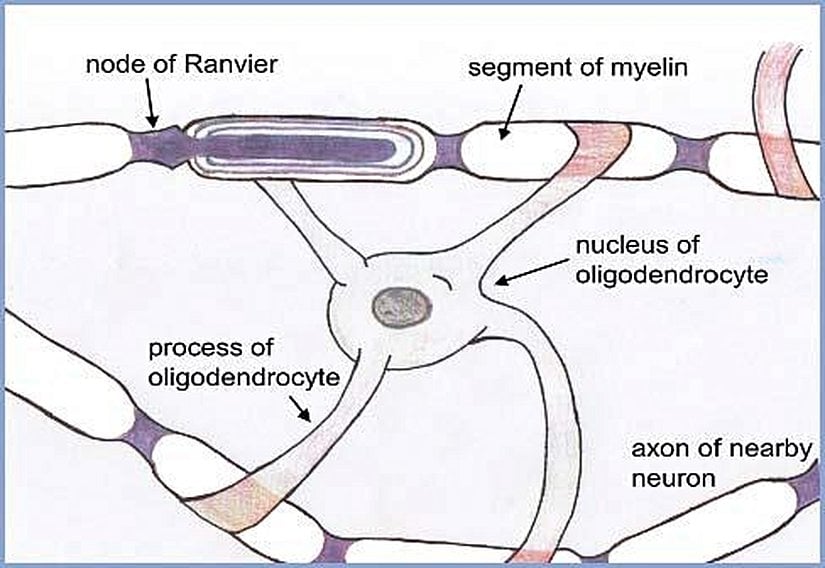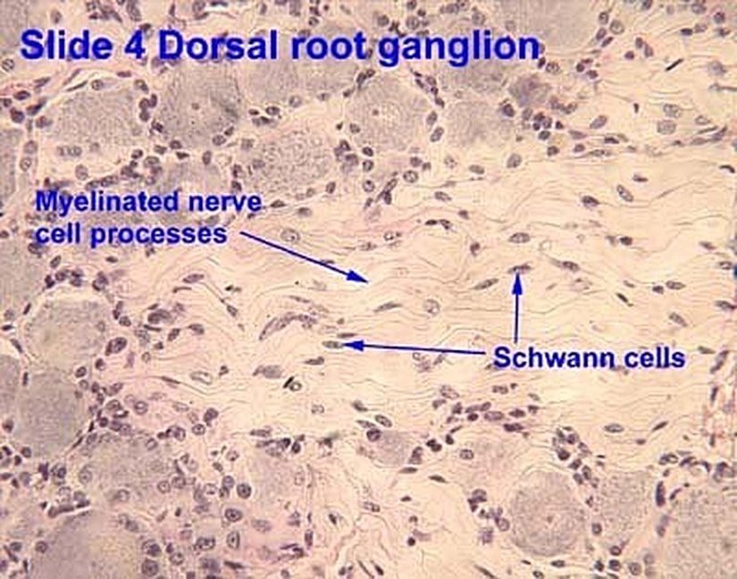 Bu hücre, aşağıya doğru 100 kadar miyelin tabakası salgılar. Mikroskop altında nöronlar etrafında boyanmış Schwann hücreleri şu şekilde görülür: