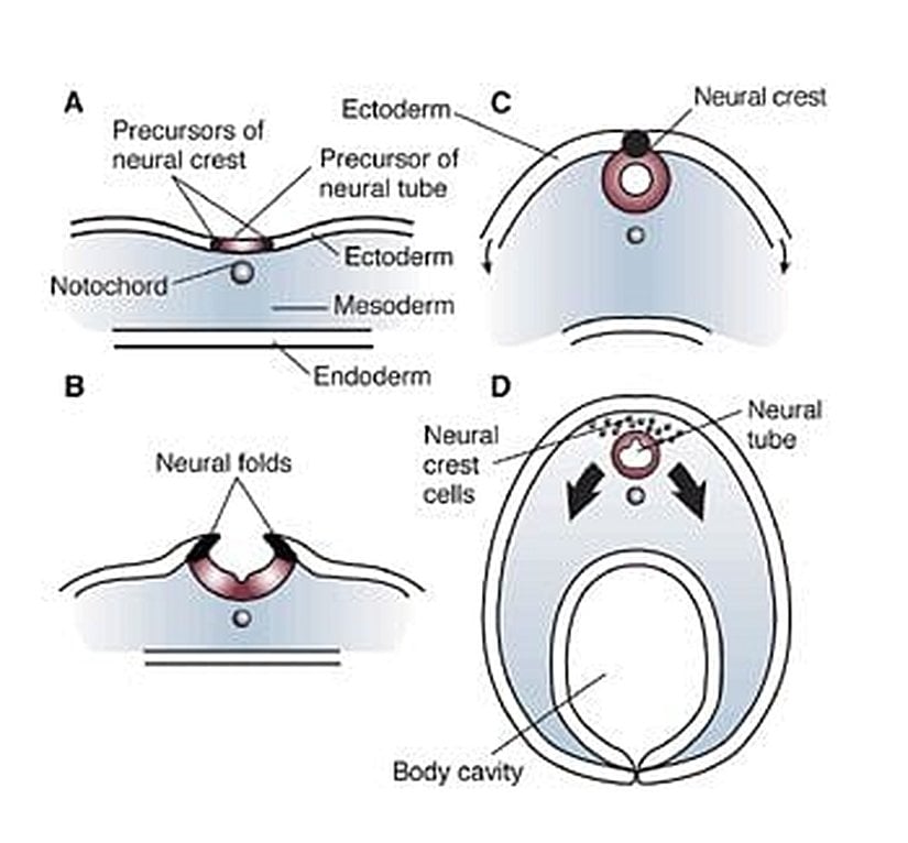 Bizim için burada önemli olan dış katmandır (ektoderm), çünkü sinir sistemi ve derimiz bu katmanın farklılaşması ile oluşur. Evrimsel süreçte, ilk yazımızı hatırlayacak olursanız, notokordlu hayvanlarda nöral tüp oluşumu gerçekleşmektedir. İnsan türü de, omurgalılara, dolayısıyla notokordlulara ait bir hayvan türü olduğu için, aynı şekilde embriyolojik dönemde evrimsel geçmişine dair izleri taşır ve 3-4. haftalar arasında nöral tüp oluşumu görülür.