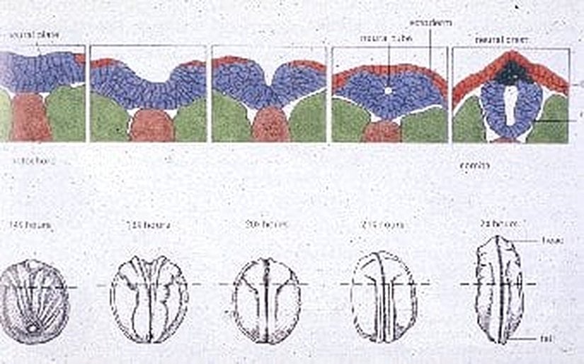 Yukarıdaki fotoğrafta bu aşamalar net bir şekilde anlatılmaktadır. A ile gösterilen kısımda, insana ait 3 katmanlı yapı net bir şekilde görülmektedir. Bu katmanlardan orta katman (mezoderm) içerisinde notokord oluşur. Bu koruyucu yapının üzerinde, dış katmanda ise nöral tübün ilk adımları atılır. Bu ilkin yapılar, embriyolojik gelişimin ilerleyen kısımlarında daha da gelişir ve katmanların içe doğru bükülüp tüp benzeri yapılar oluşturmasıyla, dış katmanda nöral tüp oluşumu gözlenir. Daha sonra boyuna büyümeyle (mitoz ile olmaktadır) bu tüp benzeri yapı giderek uzar. İşte beyin, bu tüpün ucundaki bir tomurcuk olarak oluşur ve sonrasında giderek büyür.