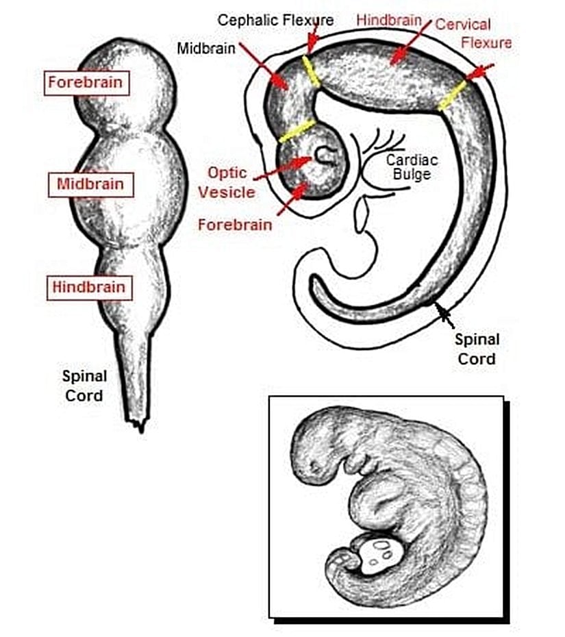 Embriyolojik dönemde ilerlediğimizde 5-7. haftalar arasında, yani 4. haftanın bitiminde beynin vezikül denen yapıları oluşmaya başlar. Bu yapıların farklılaşmasıyla, gelecek yazılarda göreceğimiz beyin bölgeleri oluşacaktır. Bir ön bilgi olarak, beynin tamamı birçok alt bölgeye ve birime bölünmüştür ve kendilerine has görevleri vardır. İşte veziküller, bu ana bölgelerin ilk adımlarıdır ve 4. haftanın sonunda gelişmeye başlarlar. 4. haftanın bitiminde 3 vezikül tamamlanır. 5. haftanın bitiminde 5 vezikül tamamlanır. 6. haftanın bitiminde ise bu 5 vezikül oldukça farklılaşarak gelişimsel dönemlerini tamamlarlar. Aşağıda bu 3 haftalık oluşum kademeli olarak gösterilmektedir.