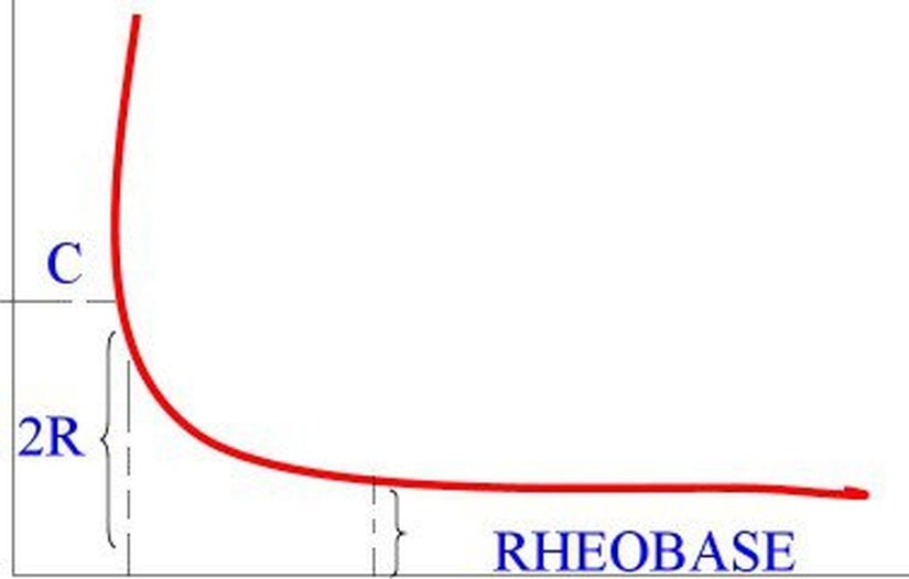 Burada düşey eksen uyaranın şiddeti (gücü), yatay eksen ise uyaranın süresi olarak geçmektedir. Görüleceği üzere şiddet arttıkça, daha kısa zamanlar uyarıya yetmektedir. Ayrıca terminolojik olarak bir sinirin gücünden bağımsız olarak uyarılması gereken en az süreye işleme zamanı (utilization time), uzunluğundan bağımsız olarak uygulanması gereken en düşük şiddete ise reobaz (rheobase) adı verilir. Yani bir siniri her şiddet ile uyarmak mümkün değildir. Eğer ki şiddet aşırı düşükse, hiçbir nöronun eşiği aşılamaz ve yıllarca da o uyaran uygulansa sinir aksiyon potansiyeli üretemez. Benzer şekilde aşırı güçlü uyaranlar da her zaman aksiyon potansiyeline neden olmaz (genelde olsalar da). Eğer ki süre aşırı kısaysa (birkaç nanosaniye gibi), kolun kesilmesindeki gibi bir uyaran olsa dahi hiçbir sinir uyarılmaz. En azından işleme zamanı denen süre kadar uyaran uygulanmalıdır. Bu sebeple aşırı hızlı kafası kesilen (idam edilen) kişilerin acı hissetmedikleri iddia edilmiştir; ancak bu henüz kesin bir şekilde test edilmemiştir.