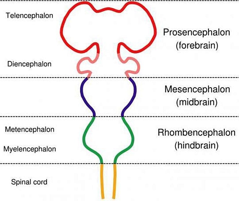 Yukarıdaki fotoğraf, genel olarak memelilerin embriyonik dönemdeki beyinlerini göstermektedir. Memeliler, evrimsel süreçte belli bir akrabalık düzeyi bulunan türleri içerdiği için, embriyolojik dönemdeki beyin yapıları da büyük oranda birbirlerine benzemektedir. Ancak sonradan, gelişimin ilerleyen kısımlarında beynin farklı yapıları, farklı türlerde, farklı miktarlada büyüyüp gelişerek türe özel nitelikleri kazandırmaktadır. Bu, sınıftan sınıfa da değişmektedir. Örneğin amfibilerde büyük bir orta beyin lobu bulunurken, memelilerde gelen olarak ön beyin lobu büyüktür. İnsanı ise insan yapan, en ön beynin (serebrum) büyüklüğüdür. İnsanın en ön beyni iptal edilecek olursa, koca cüssesine rağmen, o "meşhur" zekasndan bir gıdım bile geriye kalmaz, muhtemelen bir kurbağa ya da balık kadar sınırlı davranış tipi sergiler. Ki bunu çeşitli hastalıklarda görmekteyiz, zamanı gelince paylaşacağız bu bilgileri de.