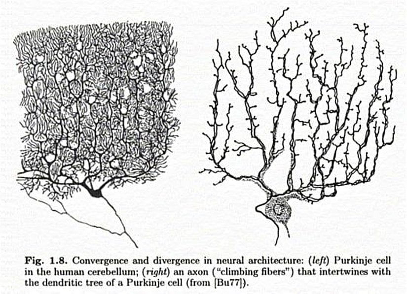 Bu görselde gördüğümüz, yüzlerce nöronun birbirine bağlantısıdır. Görüldüğü üzere, aşağıdan yukarıya giden bir sinyal, tek bir nörondan yüzlercesine paylaştırılabilir. Nöronun kimyasal yapısına göre bu sinyal büyüklük açısından küçük parçalara bölünerek de iletilebilir, eş kuvvette, birden fazla kopya üretilerek de aktarılabilir. Bu, tamamen sinapslara salınan kimyasallar ve miktarıyla ilgisi vardır. Bu kimyasalları ve miktarını ise nöronun genetik bilgisi içerir. Nöronun genetik bilgisini ise evrimsel süreç belirler. Dolayısıyla bağlantıların nasıl kurulacağı genetik ve çevresel unsurlarla belirlenir. Bu bağlantılardan ötürü, serebrumdan çıkıp kaslara gidecek veriler çoğaltılarak, kopyaları serebellumun farklı bölgelerine iletilir.