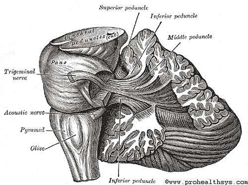 Burada sadece beyincik değil, beyin sapı da verilmiştir. Harfler, şu bölgelere karşılık gelir: