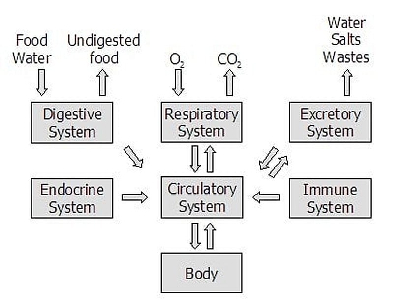 Aşağıdaki şemada, Dolaşım Sistemi'nin diğer sistemlerle olan ilişkisi görülmektedir. Tam da yukarıda izah ettiğimiz şekilde, Dolaşım Sistemi, diğer tüm sistemlerin merkezinde olarak çizilmiştir. Bu merkezilik, Sinir Sistemi'ne de atfedilebilir (bunu da gelecek yazılarımızda ele alacağız) ancak taşımacılık ve iletişim anlamında Dolaşım Sistemi'nin önemi tartışılmazdır.