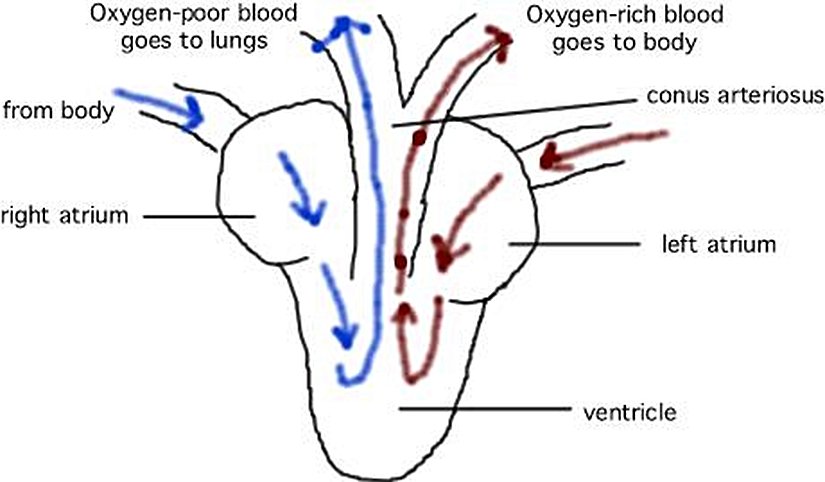 Yukarıda bir kurbağanın kalbi görülmektedir. Kanın akışı ve kirli ile temiz kanın karışımı net bir şekilde görülmektedir.