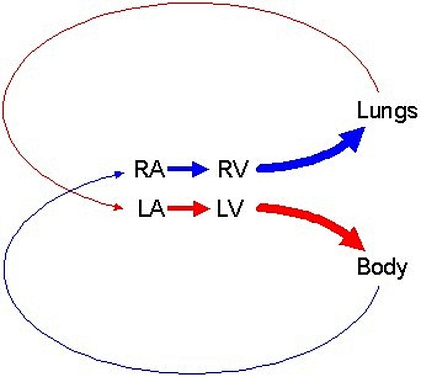 Görüleceği gibi vücuttan (body) gelen kirli kan (mavi ok), sağ kulakçığa (RA) girer. Akciğerlerden (lungs) gelen temiz kan (kırmızı ok) ise sol kulakçığa (LA) girer. Sol ve sağ kulakçıklardan pompalanan kirli ve temiz kan, sırasıyla sol karıncık (LV) ve sağ karıncığa (RV) girer, burada kesinlikle karışma meydana gelmez. Daha sonra, bu iki karıncık odasından farklı damarlara pompalanan kan (sol karıncıktan vücuda, sağ karıncıktan akciğerlere), vücut içerisinde asla birbirine karışmaz. Bu da, kuşlar ve memeliler için çok büyük bir avantajdır.