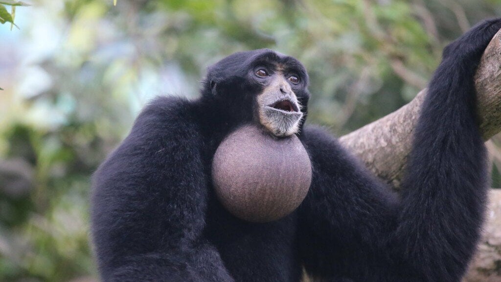 WikimediaBoyunlarının önündeki şişirilebilir ses kesesi olan gular keseleri de gibonlar arasında benzersizdir. Bu kese vokalizasyon sırasında şişer, grimsi veya pembemsi renktedir ve neredeyse bir greyfurt kadar büyüyebilir.