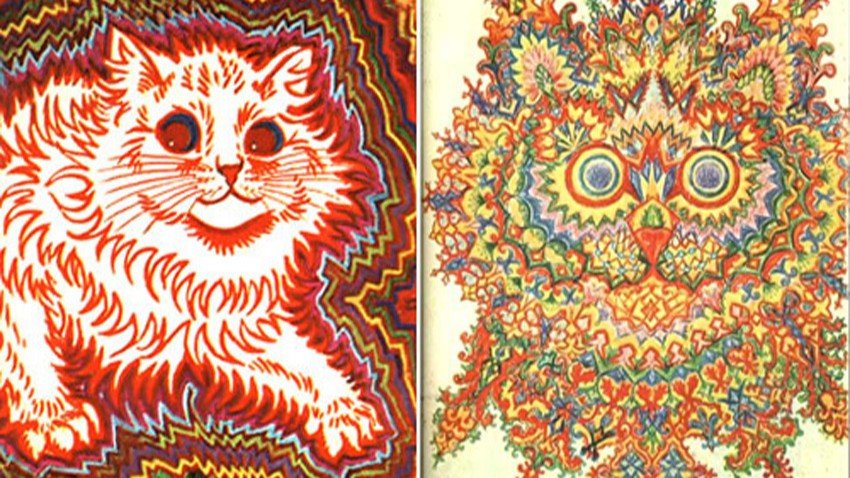 Aşağıda gördüğünüz, 1860-1939 yılları arasında yaşamış İngiliz ressam Louis Wain'in yıldan yıla şizofreniyle mücadelesine bağlı olarak kedi çizimlerinin nasıl değiştiğidir. Sağlıklı zamanlarında da insanlaştırılmış (antropomorfize edilmiş) ve iri gözlerle resmedilen kedi çizimleriyle bilinen sanatçı, hastalığa yenik düştüğü zamanlarda giderek gerçeklerden uzaklaşmıştır.