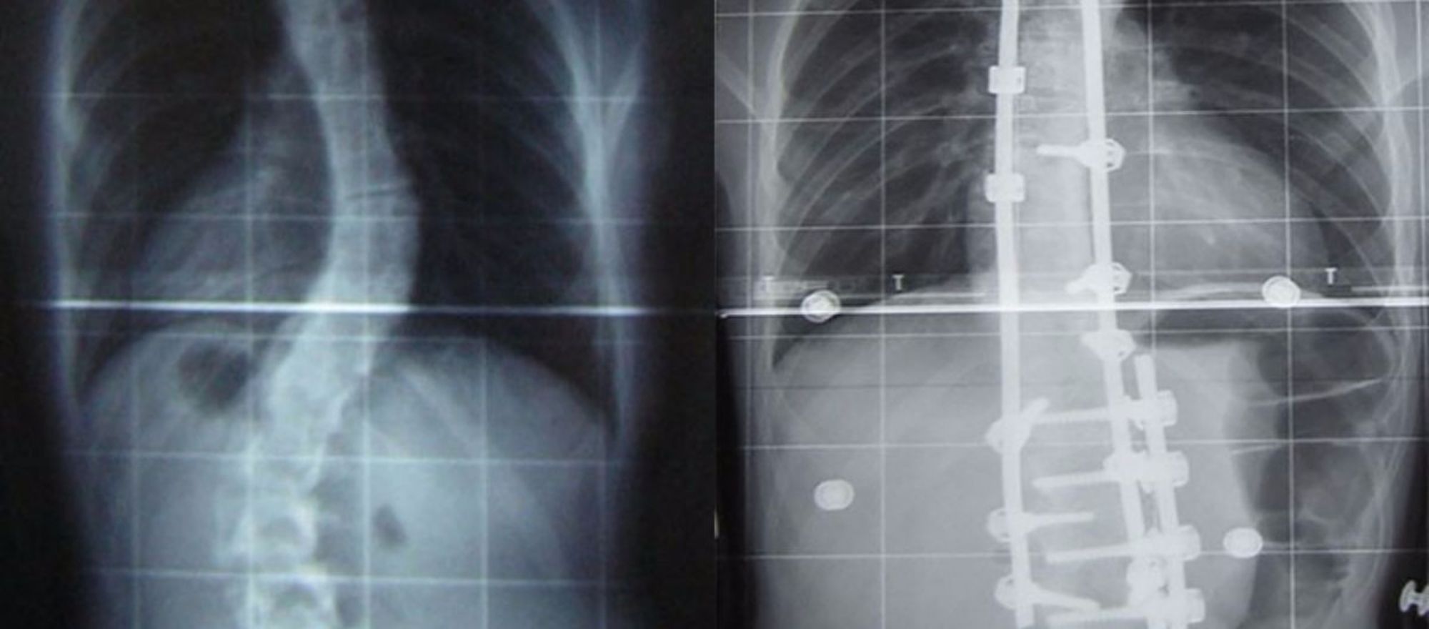 Eğer ki fotoğraftaki gibi uç vakalar (eğriliğin 45-50 dereceyi aştığı vakalar) söz konusuysa, genellikle ameliyatla tedavi önerilmektedir. Bu da bizi sağ taraftaki fotoğrafa getirir. Sağdaki fotoğraf, soldaki gibi bir bireyin ameliyat sonrası omurgasının düzeltilmesi ve bu düzeltmeyi sürekli kılmak için yerleştirilen metal köprüleri göstermektedir. Ne yazık ki skolyozlu bir omurgayı genellikle tamamen düzeltmek mümkün olmamaktadır; ancak çoğu zaman yapılan düzeltmeler, eski hale göre fazlasıyla rahat yaşam standartları sağlamaktadır.
