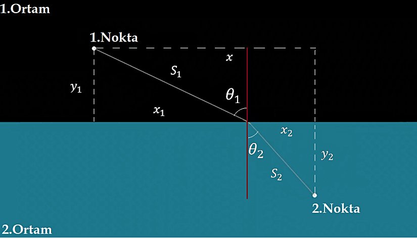 1. noktanın ışığın kırıldığı noktaya olan uzaklığını öyle bir belirleyelim ki ışığın iki nokta arasında yol alırken geçen zamanı minimum yapsın. Bunu matematiksel olarak şu şekilde gösterebiliriz: