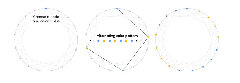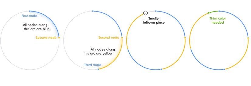 Bu şekilde, artan bir segmentte kalan düğümler hariç grafikteki tüm düğümlere bir renk atamış olacağız. Son boyadığımız yayı sarı boyamış olalım. Daha küçük segmenti maviye boyayamayız çünkü bu düğümler maviye boyadığımız orijinal yaydaki düğümlere bağlanacaktır. Sarı da kullanamayız, bu düğümler önceki yaydaki sarı düğümlere geri bağlanır. O halde üçüncü bir renk olan yeşil kullanmamız gerekmektedir. Bu şekilde sarı, mavi ve yeşil düğüm kümeleri ölçülebilir olmuştur. Çünkü bu kümeler çemberin çevresinin parçalarıdır.