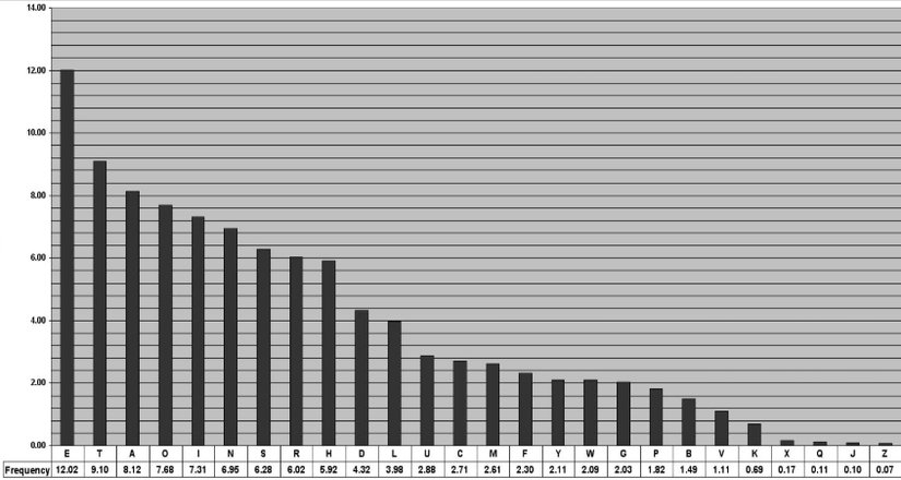 Bu tarz bir mesajın nasıl şifrelendiğini anlamanın yolu, şifrelenmiş mesajdaki harflerin frekansına bakmaktır. Cornell Üniversitesinde yapılan bir araştırmaya göre en sık kullanılan yedi harf; e, t, a, o, i, n ve s'dir.