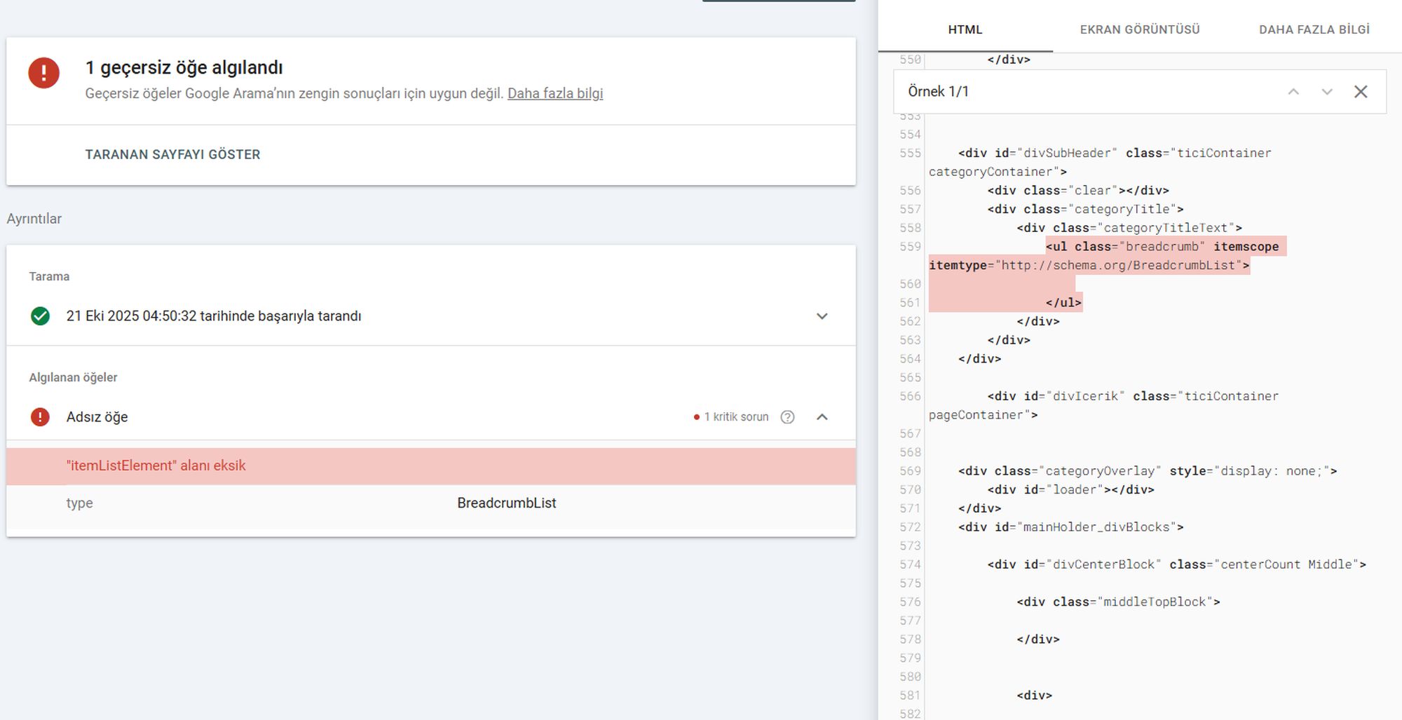 Google Search Console İtemListElement bu hatayı nasıl gidereceğim?
