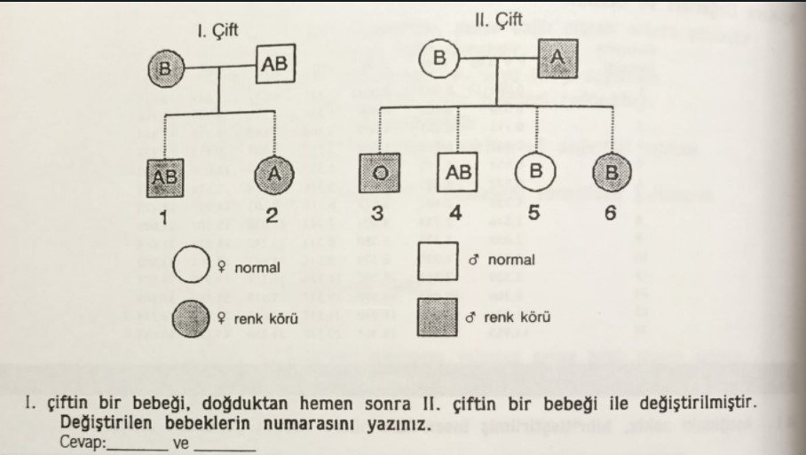 Öncelikle 2 numaralı bebek 1. çifte ait olamaz çünkü renk körü olarak verilmiş. Ama 1.çifte baktığımızda renk körü bir kız oluşturma ihtimalleri yok nedeni ise: Babada bulunan dominant gen yani babanın geni XRY olduğundan çaprazlama ile XrXr diye bir birey oluşamaz. Buradan 2 numaralı bireyin aslında 2.çifte ait olduğunu öğrendik.