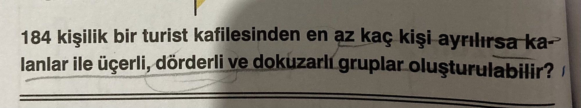 184 kişilik bir turist kafilesinden en az kaç kişi ayrılırsa kalanlar ile üçerli, dörderli ve dokuzarlı gruplar oluşturulabilir?