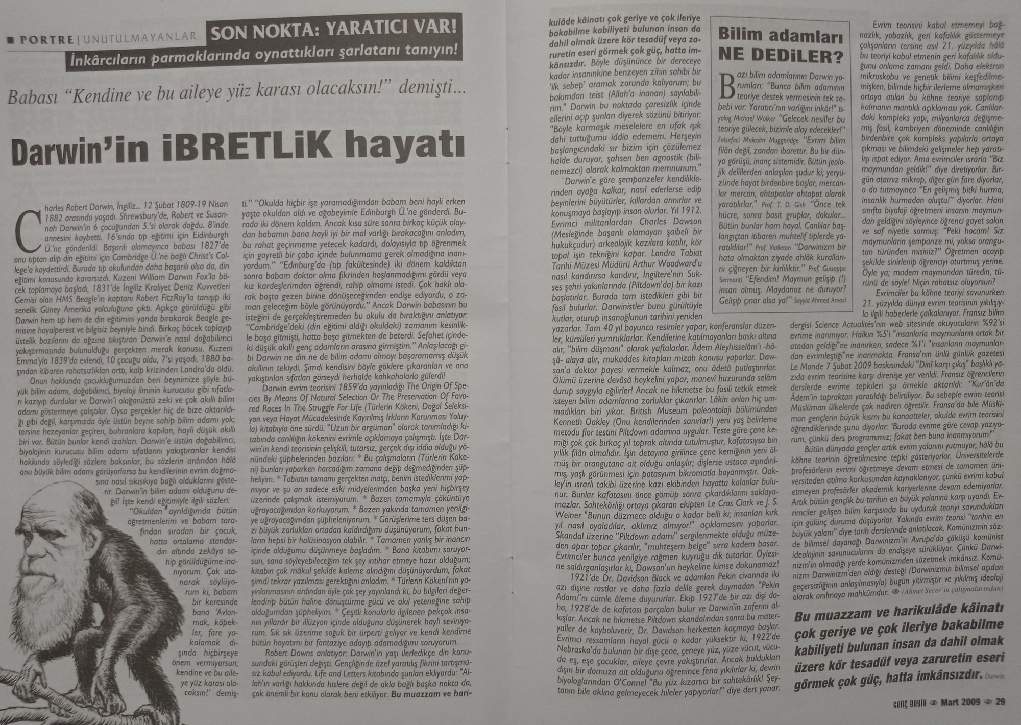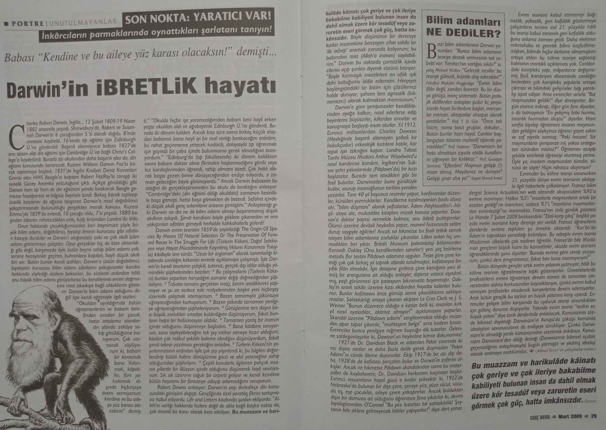 Evrimsel biyoloji her gün evrimsel tarihimizin ayrıntılarını aydınlatırken, bu kişiler "kahvehane muhabbeti" yaparcasına burada hatasını anlattığım komplo teorilerini sunup "Evrimciler bir gün maymundan geldik diyor, bir gün fareden geldik diyor." diye uydurup (ki buradan "genetik" verileri görebileceğiniz üzere insan ile farelerin 87 milyon yıl önce "ortak atası" var.) "Siz şempanze misiniz yoksa orangutan mı?" tarzında çocukça laflar atıyorlar. Bu laf atmalar buradan okuyabileceğiniz üzere yüz yıllar öncesinin dincilerinde de aynen var. Evrim karşıtları gerçekten bir adım yol kat edemiyorlar ve bunları da bir dergi çıkartıp basabiliyorlar...