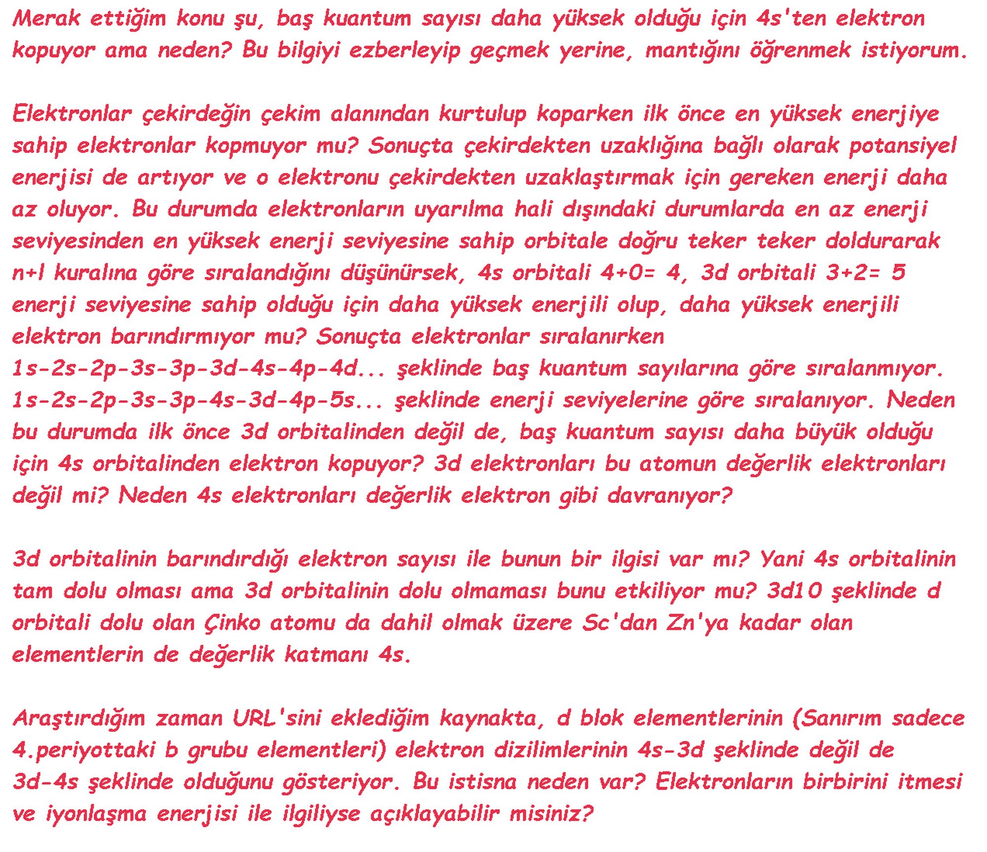 4s2 3d1 ile biten 21 numaralı Sc atomunu +2 katyon haline getirirken,normalde elektronlar 4s orbitalini doldurduktan sonra 3d orbitalini doldurmaya başladığı için,3d'nin enerjisi daha yüksek dolayısı ile o orbitaldeki elektron daha yüksek enerjiye sahip olup,ilk olarak 3d'den elektron kopması gerekmiyor mu?Sorumu eklediğim görselde detaylandırdım.