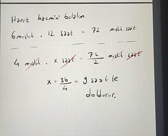 Yukarıda detaylı bir şekilde anlattığım üzere çok basit 2 adet matematik denklemi ile bu problemin cevabına ulaşabilirsin. Öncelikle musluk adeti ile çalışma saatini çarparak havuz hacmini elde ediyoruz sonrasında musluk sayısını 2 azaltıp havuz hacminide yarıya indirip eşitlikten x dediğimiz çalışma saatini buluyoruz.