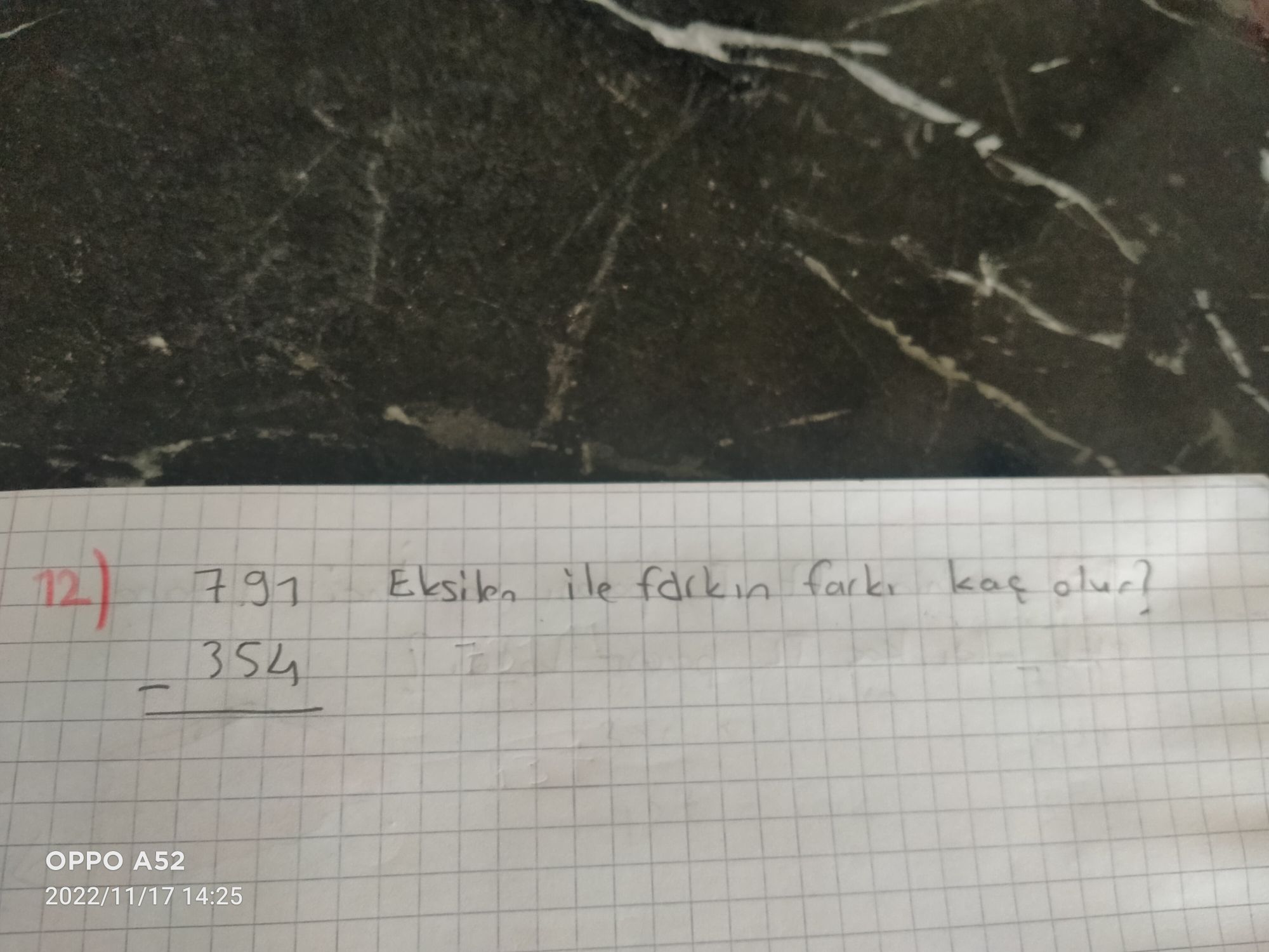 Eksilen 791dir, çıkan 354 ve bu ikisi çıkartılınca sonuç fark olur bu durumda fark 437dir ve eksilen 791 ise farkta 437 ise 791den 437 çıkartırsan sonuç 354 olur. Eksilen ilk sayıya denir ve çıkanda eksilenden çıkartılan sayıdır.