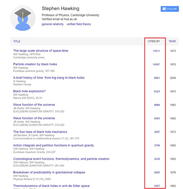 Daha da iyi anlamak için, Stephen Hawking örneği üzerinden gidelim: Hawking'in toplamda yüzlerce makalesi var. Bunların her biri değişen sayılarda atıf alıyor.