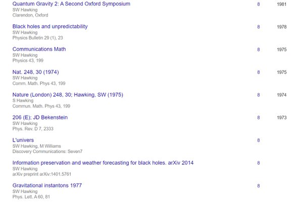 Hawking'in nasıl büyük bir bilim insanı olduğunu anlamak isterseniz, bazı makalelerinin aldığı bazı atıf sayıları şöyle: