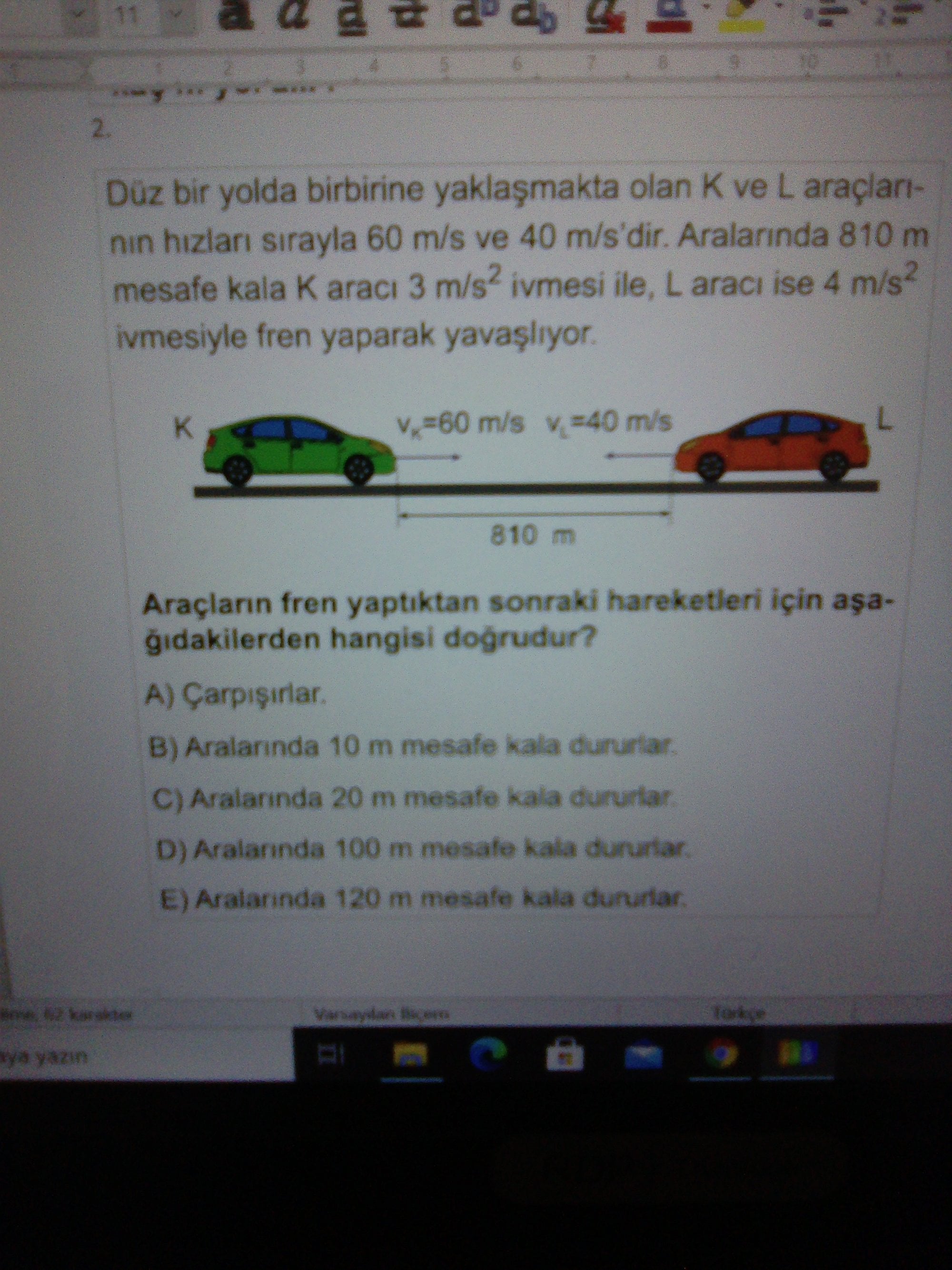 K aracının durumuna bakalım; Vk=60 m/s, aK= -3 m/s2 bu durumda yine "V= a x t" formülünden 20 saniye sonra aracın duracağını bilebiliriz. Peki 20 saniye sonra bu araç nerde olmalıdır? Yine "x= V x t" formülünden tamamen durduğunde 1200 m mesafe kat etmiş olacağını buluruz.